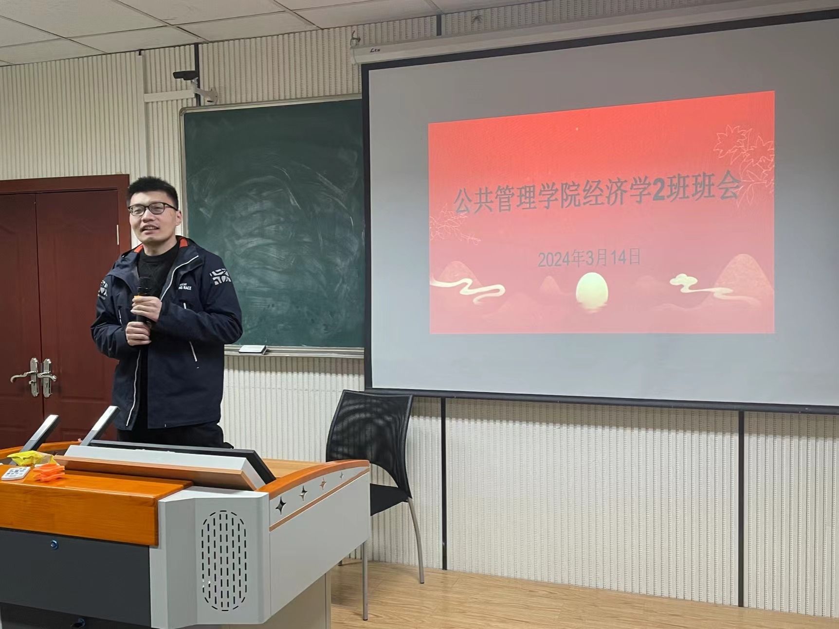 2022级经济学2班2023-2024下学期第一次班会在性爱直播楼104顺利召开。本次班会由2022级经济学2班班主任党敬淇老师主持,经济学2班全体同学参与。会议分为自我介绍、建议和交流答疑三个部分,展现出了班级的团结和活力。