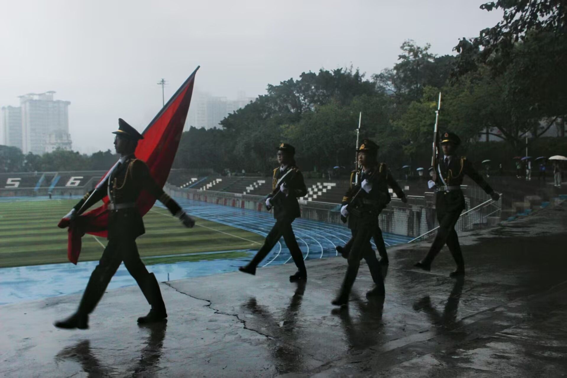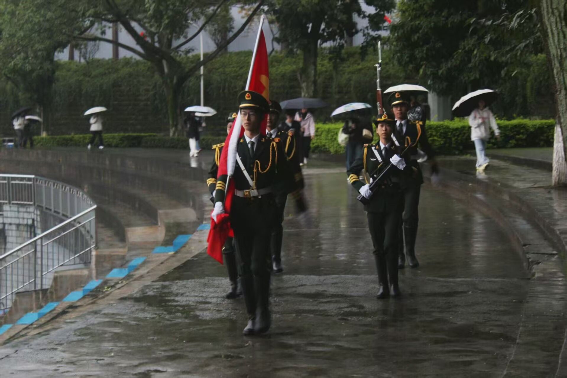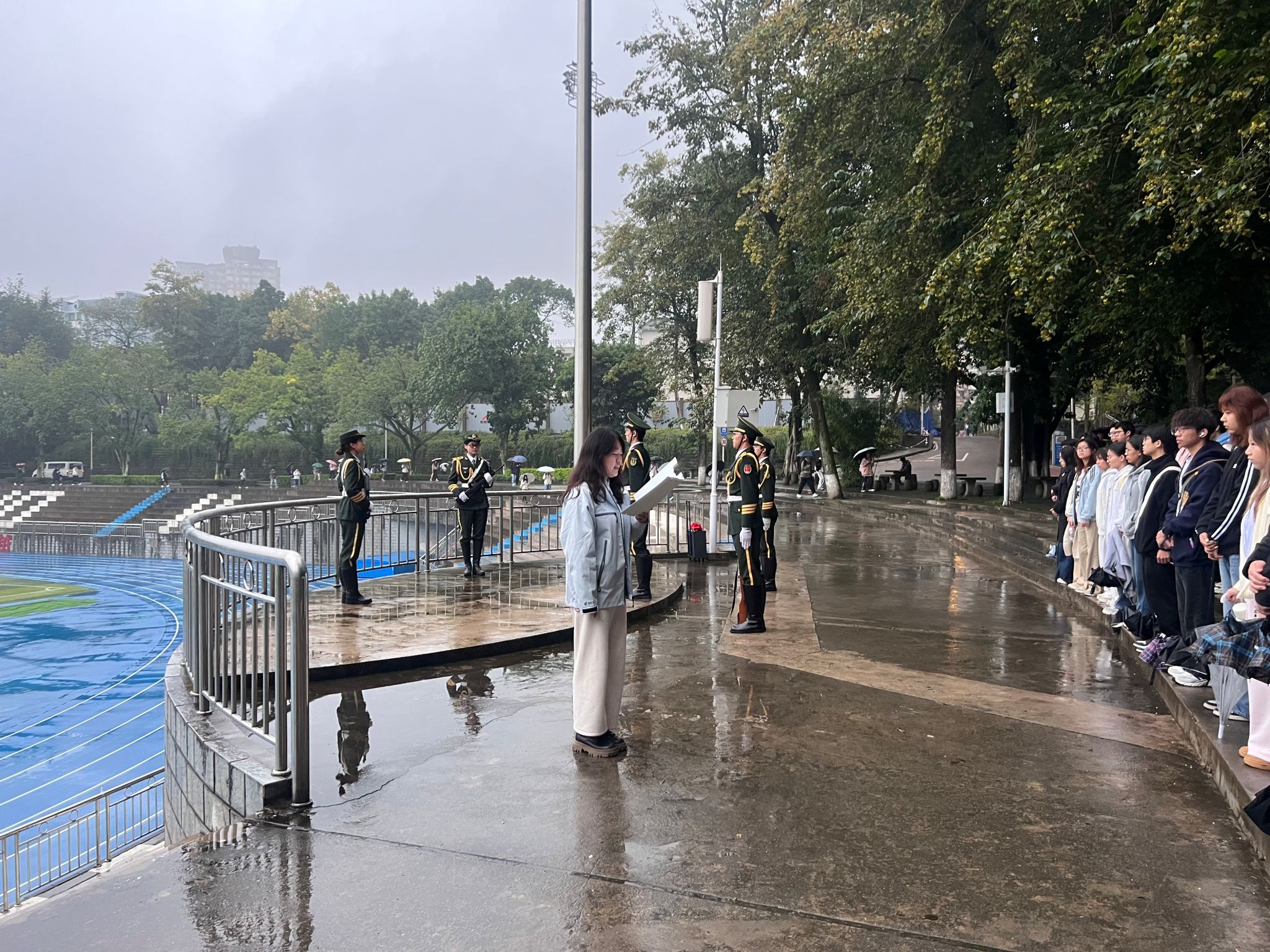 初冬清晨,晨光微露,濛濛细雨为活动增添了几分肃穆。全体学生列队整齐、肃立广场,目光聚焦于国旗行进方向。伴随着铿锵有力的步伐,学校国旗护卫队队员英姿飒爽,昂首挺胸护送五星红旗至升旗台。当庄严的《义勇军进行曲》奏响,激昂的旋律回荡在广场上空,同学们神情庄重,高声齐唱国歌,向冉冉升起的五星红旗行注目礼,爱国之情在每个人心中油然而生。